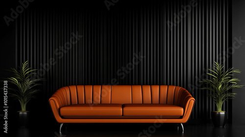 A modern living room with a brown leather couch in front of a black wall with vertical grooves.