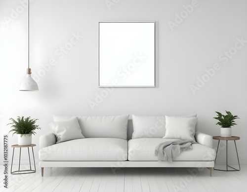 A modern living room with a large white sofa, a blank framed canvas on the wall, and minimalist decor.