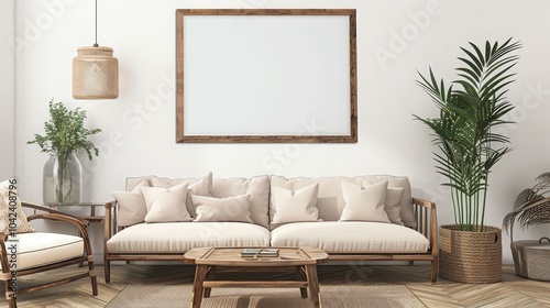 living room, sofa, couch, white, coffee table, wooden, modern, frame, canvas, plant, decor, interior, design, home, neutral, minimal, airy, light, natural, style, room, cushion, pillow, basket, rug, floor, wood, wall, lamp, lighting, art, furniture, house, cosy, contemporary, minimalist, chic