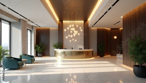 A modern lobby featuring elegant marble floors and a stunning chandelier hanging from the ceiling