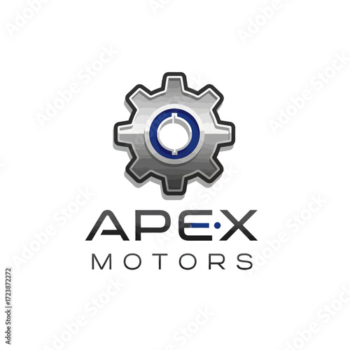 A modern logo for Apex Motors featuring a metallic gear icon with a blue inner circle above the company name.