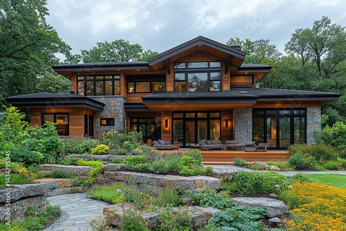 house, home, architecture, exterior, design, modern, luxury, wooden, stone, glasses, window, landscape, garden, plant, greenery, tree, sky, cloudy, natural, daylight, terrace, patio, pathway, paseo, facades, structure, contemporary, residential, upscale, elegant, stylish, aesthetic, detail, craftsmanship, lighting, front, view, property, construction, building, material, element, feature, backyard