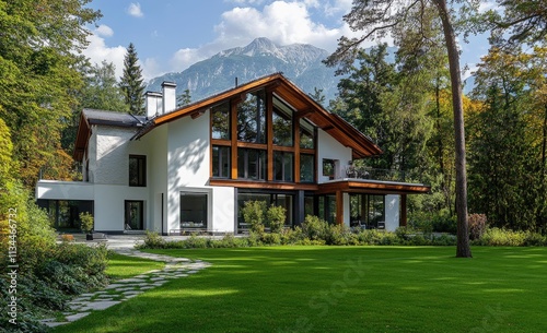 A modern luxury house in an urban area with white walls, wooden accents, and large windows on the first floor