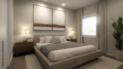 A modern minimalist bedroom with low-profile furniture, abstract artwork, and neutral bedding.