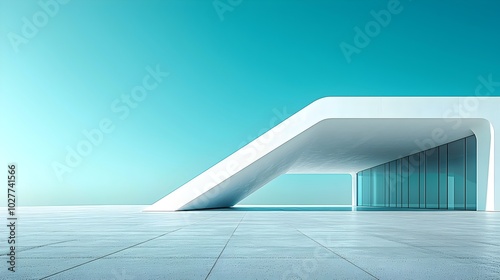 A modern, minimalist building with a curved roof and large glass windows against a bright blue sky.