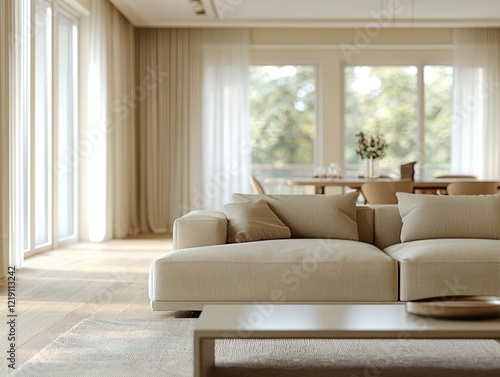 A modern minimalist interior design of a residential living room with dining room view and sofa and table. Generative AI