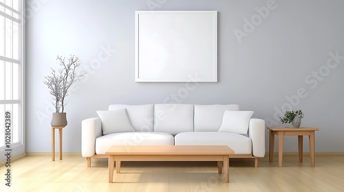 A modern minimalist living room with a sleek white sofa, light wooden furniture, and a blank white frame hanging above a coffee table, creating a fresh and airy feel.