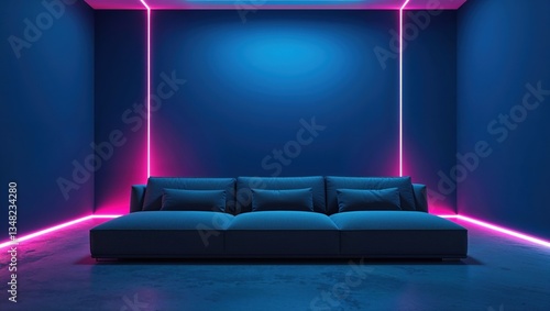 couch, blue, neon, lighting, modern, minimalist, design, interior, space, decor, stylish, comfort, ambience, furniture, wall, home, aesthetic, contemporary, relaxation, seating, cosy, urban, art, trendy, chic, atmosphere, high-coloured, bright, shadow, texture, smooth, line, geometric, layout, room, creative, visual, elegance, simplicity, trend, attracted, inviting, warmth, personality, colours, contrast, illumination