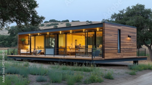 A modern modular home featuring sleek, stackable units and sustainable materials.