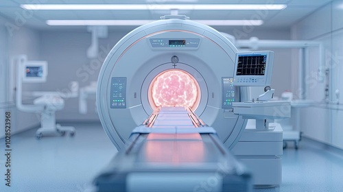 A modern MRI machine in a bright, sterile medical environment ready for imaging procedures.