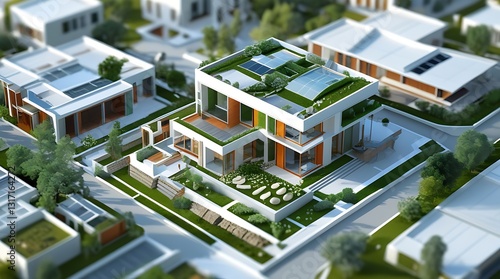 A modern multi-tiered house with green rooftops and solar panels is surrounded by lush landscaping and neighboring homes in a well-planned residential area, showcasing sustainable urban living.