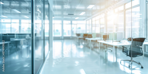 A modern office interior with glass walls and white floors is blurred, creating a business background concept with a bokeh light effect.