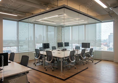 A modern office space featuring a glass enclosed conference room with computers and rolling window shades