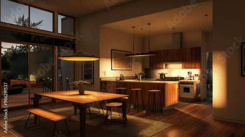 kitchen, dining, table, bar, stool, modern, open, concept, warm, lighting, cosy, interior, design, wooden, furniture, contemporary, home, evening, stylish, roomy, natural, light, minimalist, decor, seating, appliance, countertop, area, architecture, living, space, relaxation, family, entertaining, ambience, bright, inviting, comfortable, elegant, chic, layout, homelike, atmosphere, aesthetic, element, furnishing, material, fixture, environment