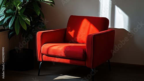 chair, red, furniture, interior, modern, plant, home, shadow, light, sunlight, window, houseplant, pot, leaf, green, design, comfort, relaxation, empty, indoor, wooden, floor, decor, seating, armrest, cushion, daylight, minimalist, contemporary, background, corner, simple, apartment, urban, style, pattern, closeup, detail, vibrant, warm, surface, natural, soft, texture, fabric, black