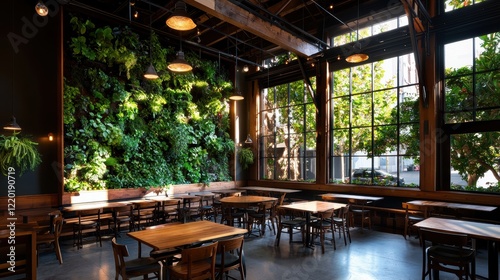 A modern restaurant with exposed wooden beams, large windows, and a living green wall, featuring wooden tables and a welcoming ambiance.