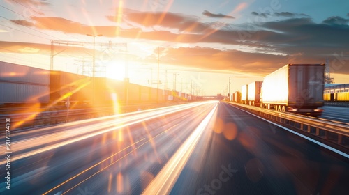 A modern semi-truck driving on a highway at sunset, showcasing transportation, logistics, and long-haul trucking services..