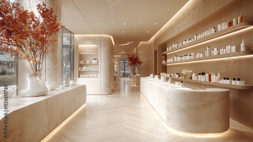 beauty, retail, interior, design, skincare, product, shelf, lighting, modern, minimalism, decor, ambience, warm, inviting, space, natural, aesthetic, arrangement, elegance, atmosphere, furniture, counter, display, service, boutique, cosmetic, layout, organisation, colours, texture, harmony, simplicity, luxury, environment, wellness, calmness, nature, floral, contemporary, style, relaxation, shopping, life events, visual, attracted, warmth, sophistication, clean, line