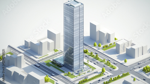 A modern skyscraper in an isometric cityscape, presented in a minimalist low-poly design