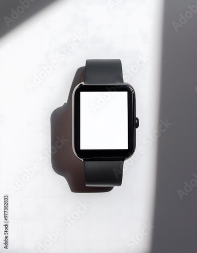 A modern smartwatch with a blank screen on a white background.