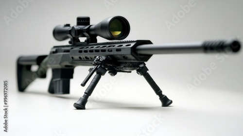 A modern sniper rifle, designed to fire .338 caliber bullets, is shown with a bipod. The rifle stands alone against a clean white background.