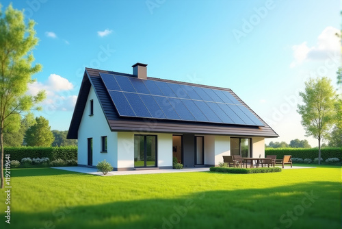 A modern suburban house with solar panels installed on its roof, surrounded by a lush green lawn and clear blue skies.