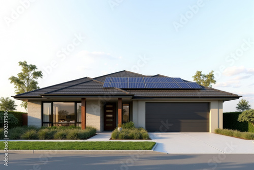 A Modern Sustainable house with sleek solar panels integrated into a flat roof, framed by minimalist landscaping.