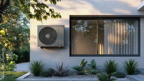 A modern villa exterior with a discreet air conditioning unit installed on the wall near a window.