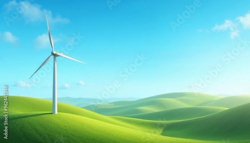 A modern wind turbine towers over green hills under a clear blue sky, highlighting the blend of technology and nature with abundant sunlight and a fresh, vibrant landscape.