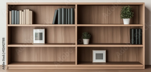 A modern wooden bookshelf with books, plants, and picture frames, set against a neutral wall, creating a clean, organized aesthetic.