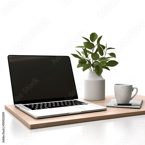 A modern workspace with a laptop, keyboard, and coffee cup on a sleek desk, ready for digital work and online communication