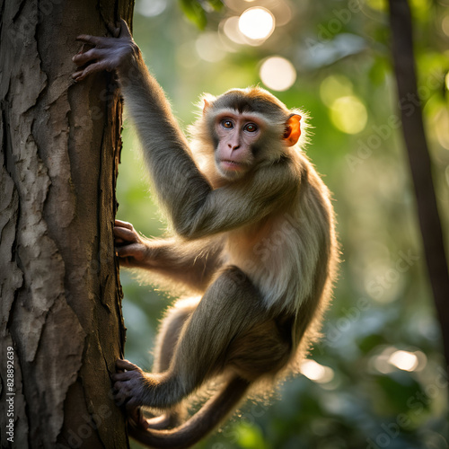 A monkey on a branch of a tree in the forest nature animal looked at camera with blurred background