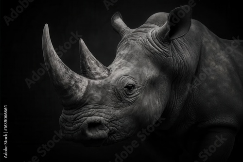 A monochromatic portrait of a rhinoceros against a stark black backdrop