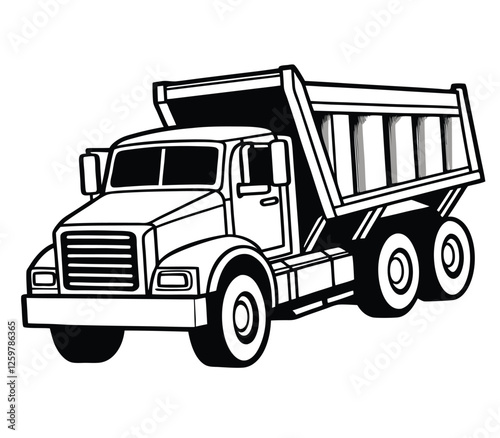 A monochrome illustration of a dump truck with clean outlines, perfect for children's coloring books.