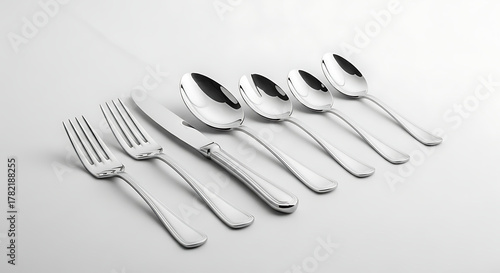 silverware, cutlery, fork, knife, spoon, tableware, metal, shiny, utensil, kitchen, dining, table, elegant, modern, design, flatware, steel, chrome, polished, still life, arrangement, monochrome, black-and-white, greyscale, minimalist, clean, white background, studio shot, closeup, macro, detail, silver, domestic, household, dinnerware, eating, food, object, tool, implement, service, catering, eatery, formal, setting, cookware