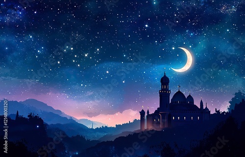 A mosque silhouette against the night sky with stars and a crescent moon, symbolizing Ramadan Kareem.