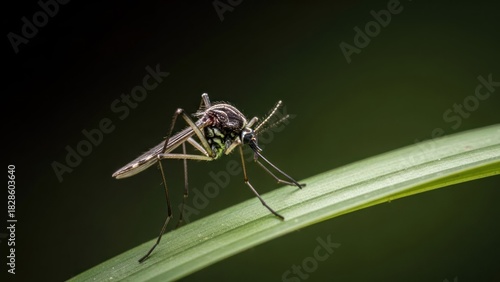 A mosquito perched on a green leaf with a dark green background.