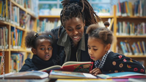 A mother and child reading together in a cozy library, fostering a love for books and learning in a warm and supportive environment.