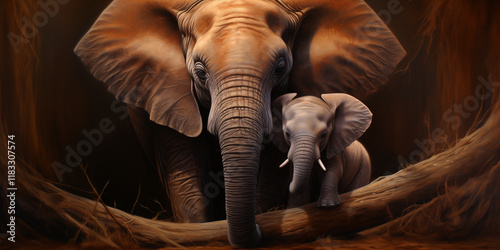 A mother elephant gently touches her calf with her trunk in a warm, hazy setting.