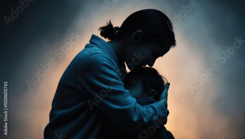 A mother embraces her child in a warm, tender moment captured against a softly lit backdrop