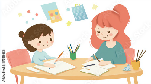 A mother guiding her child through homework or drawing at a desk
