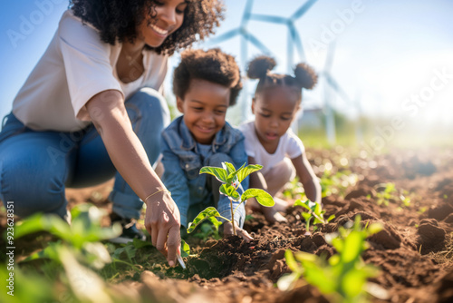 A mother is teaching her children how to plant seedlings in a field , enjoying the outdoor activity. Wind turbines in the background, a commitment to sustainability and environmental awareness.