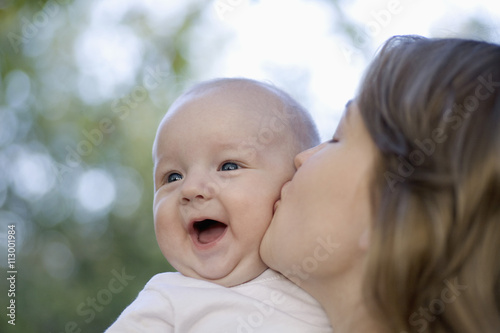 horizontal, colours, photo, two people, missy, adult, boy, children, children, male, male, baby, woman, adult, outdoors, day, caucasian appearance, human head, human face, closeup, smiling, mouth open, selective focus, childhood, innocence, cute, new life, part of, mother, son, love, togetherness, bonding, care, portrait, affectionate, kissing, happiness, laughing, series, lifestyle