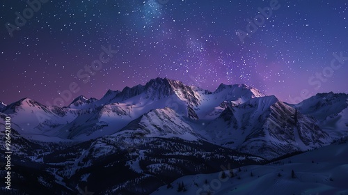 A mountain range covered in snow with a starry sky above.