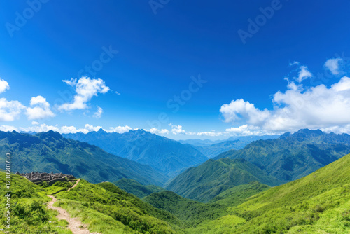 mountain, range, clear, blue, sky, cloud, lush, green, bright, travel, peaceful, landscape, serene, nature, outdoors, view, summer, tour tourism, scenery, beauty, vale, forest, background, scenic, rock, hill, environment, panorama, peak, hiking, high, vacation, park, tree, europa, adventure, stone, panoramic, grass, season, caucasia, alps, meadow, scene, countryside, spring, day, sochi, ridge