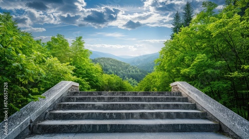 A mountain range with a forest in the background. The forest is lush and green, and the sky is clear and blue. Concept of peace and tranquility, as if one were standing on a mountain top