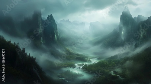 A mountain range with a river running through it. The sky is cloudy and the atmosphere is mysterious