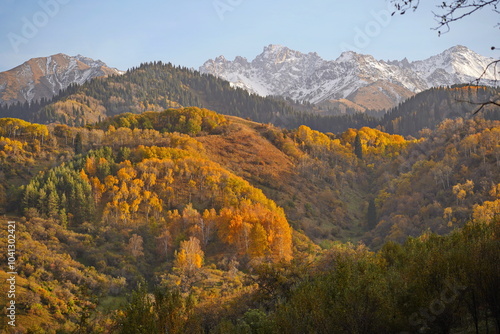 environment, beauty, colours, tree branch, ecology, rock, wood, season, natural, countryside, asia, leaf, tour tourism, tree, colours, vale, blue, kazakhstan, rocky, high, meadow, hiking, alpine, forest, yellow, beautiful, mountain, fall, nature, peak, october, autumn, travel, landscape