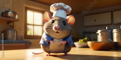 A mouse wearing a chef's hat and uniform, standing on top of kitchen counter