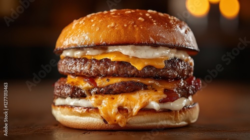 A mouthwatering beef burger stacked high with cheese, bacon, and sauces captures the eye with its rich colors and enticing textures, promising a satisfying culinary experience.